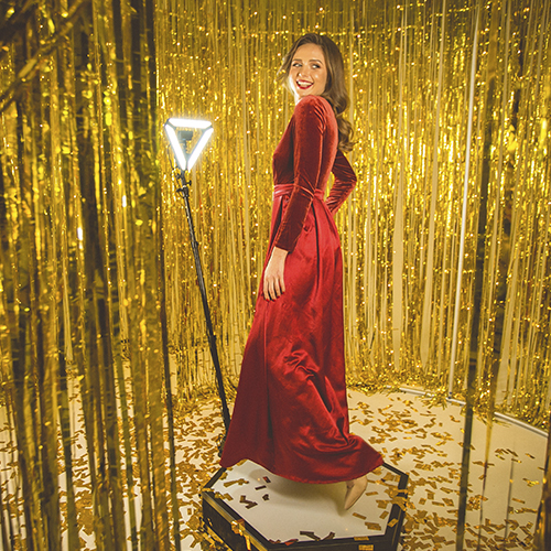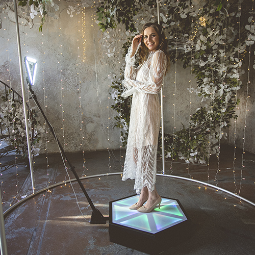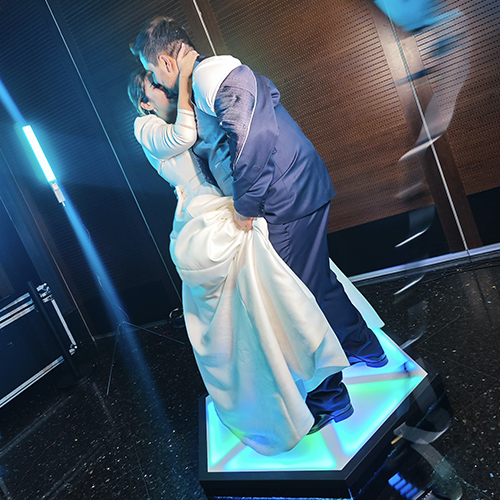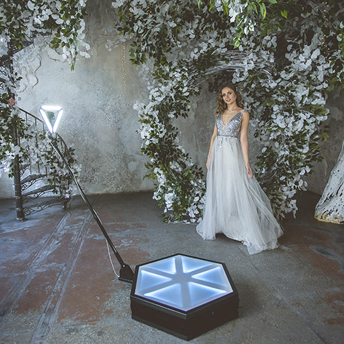 Los participantes acompañados de nuestros azafatos subirán a la plataforma de 1,15 m de diámetro, que es fija y soporta un peso de hasta 500 kg, aproximadamente 4 personas. El brazo de la tarima girará alrededor de ella y la cámara captará los movimientos de los invitados desde todos los ángulos.